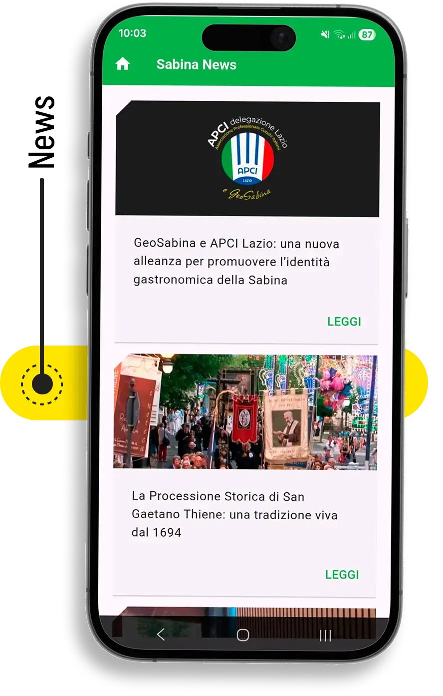 La sezione News di GeoSabina è il tuo punto di riferimento per sapere sempre cosa accade nel territorio. Eventi, avvisi comunali, iniziative locali, allerte meteo e comunicazioni ufficiali: tutto raccolto in un’unica schermata, aggiornata in tempo reale. Niente più ricerche infinite tra siti e social con GeoSabina hai le notizie che contano sempre a portata di mano. Ogni informazione è chiara, verificata e pensata per aiutarti a vivere al meglio la tua comunità.