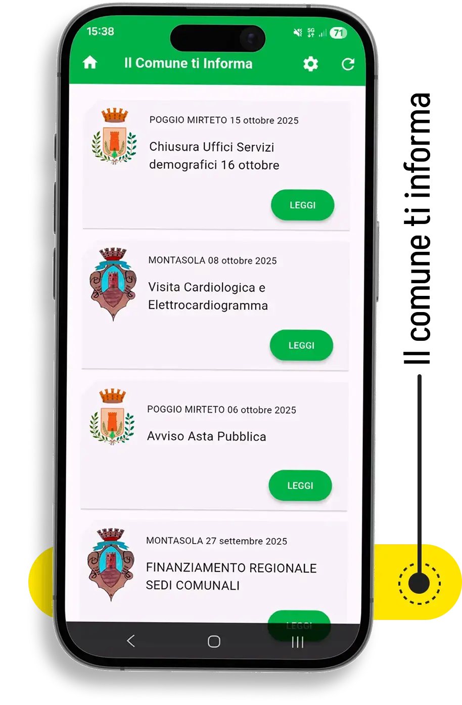 Con la sezione Il Comune ti informa ricevi in tempo reale avvisi, aggiornamenti e comunicazioni istituzionali dal tuo Comune. Niente più bacheche o siti difficili da consultare: le informazioni più importanti arrivano subito, in modo chiaro e affidabile. Dalle ordinanze alle allerte meteo, dagli avvisi di servizio alle novità per i cittadini tutto è raccolto in un unico spazio, sempre a portata di mano.