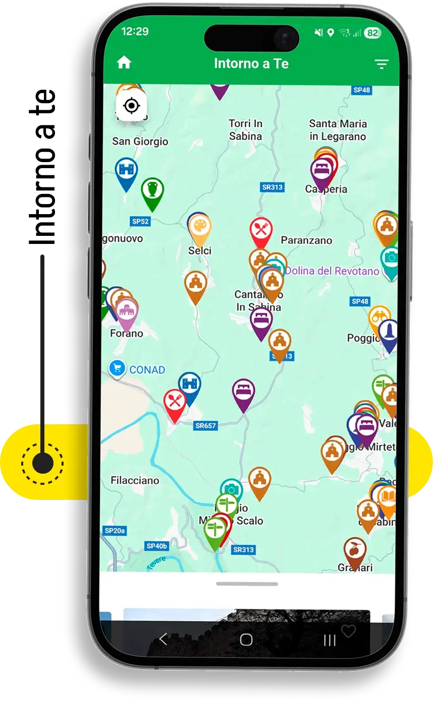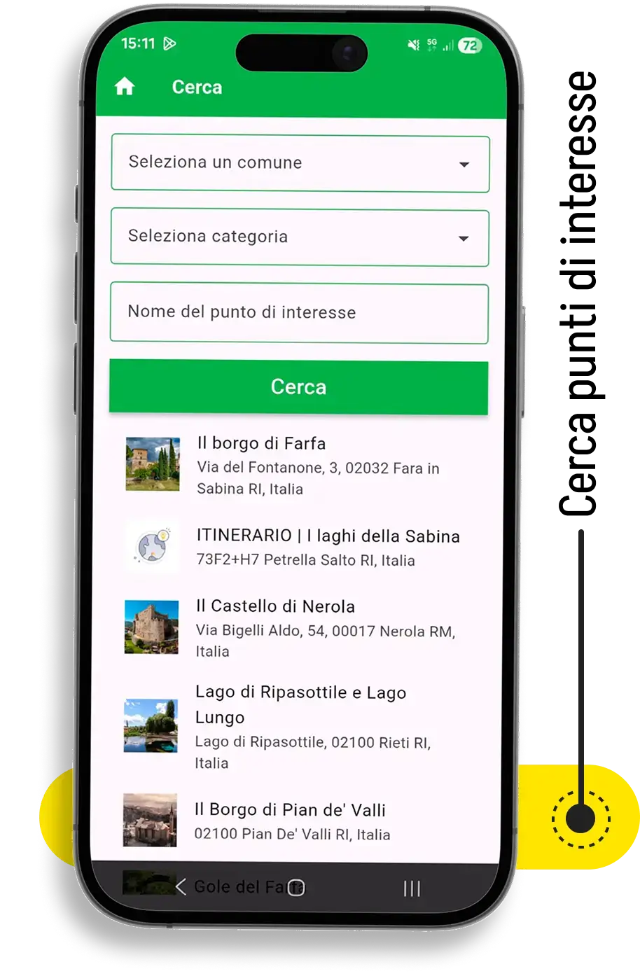 La sezione Cerca Punti di Interesse ti permette di esplorare il territorio in modo semplice e veloce. Scopri monumenti, borghi, chiese, punti panoramici, itinerari, attività nella natura, dove dormire e dove mangiare in Sabina. Ti basta aprire la sezione, digitare ciò che cerchi e GeoSabina ti mostrerà tutto sulla mappa. Ogni punto è accompagnato da informazioni utili, contatti e indicazioni per raggiungerlo facilmente.