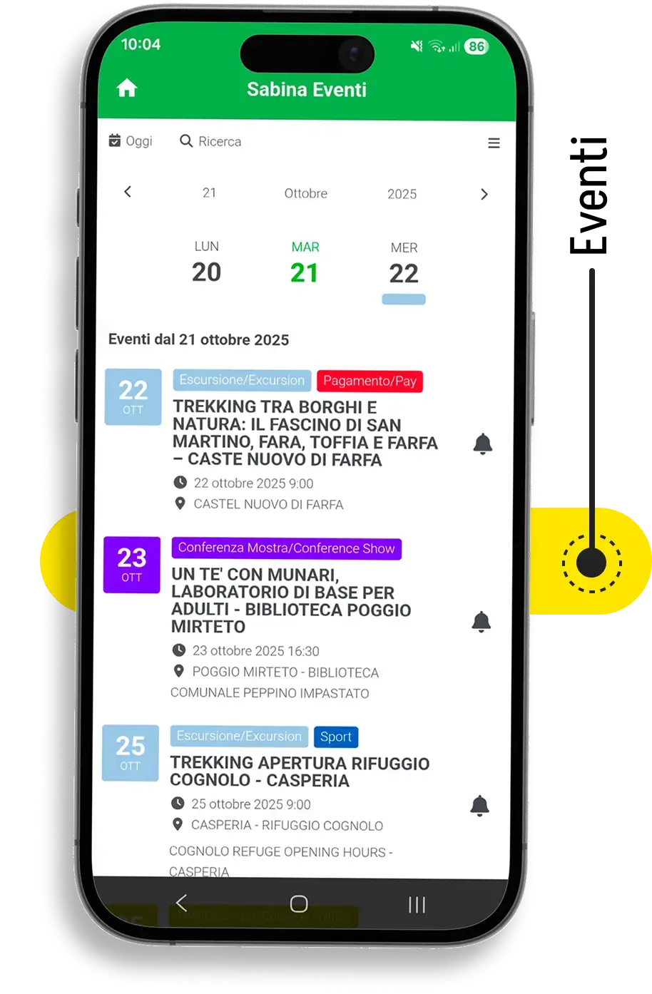 Con la nuova APP, oltre ad avere tutte le informazioni del sito geosabina.it e accedere alle sezioni NEWS e EVENTI, potrai restare informato sulle attività dei municipi tramite la nuova funzione IL COMUNE TI INFORMA e utilizzare la funzione INTORNO A TE per sfruttare la mappa interattiva e raggiungere facilmente i punti di interesse più vicini.