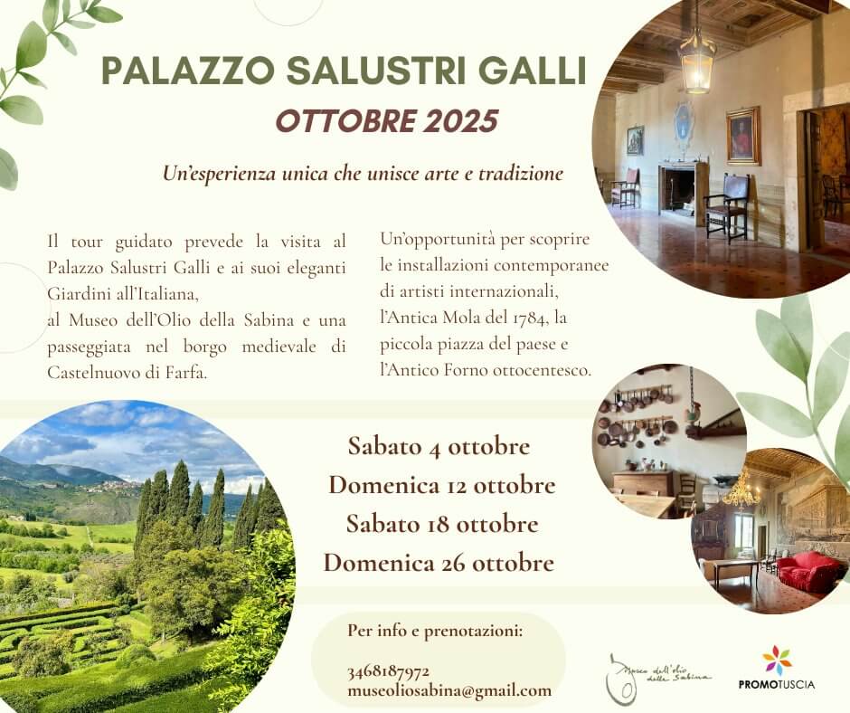 TOUR GUIDATO PALAZZO SALUSTRI GALLI, MUSEO DELL’OLIO E BORGO MEDIAVALE – CASTEL NUOVO DI FARFA